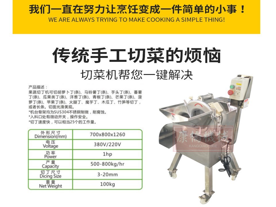 詳細信息 訂貨號000214 加工定制是 貨號214 種類切丁機 品牌康橋 型號800 電壓380(V) 功率5(Kw) 外形尺寸1300(mm) 凈重320(Kg) 包裝木架 適用范圍茶餐廳設備,西餐店設備 營銷新品 售后服務365