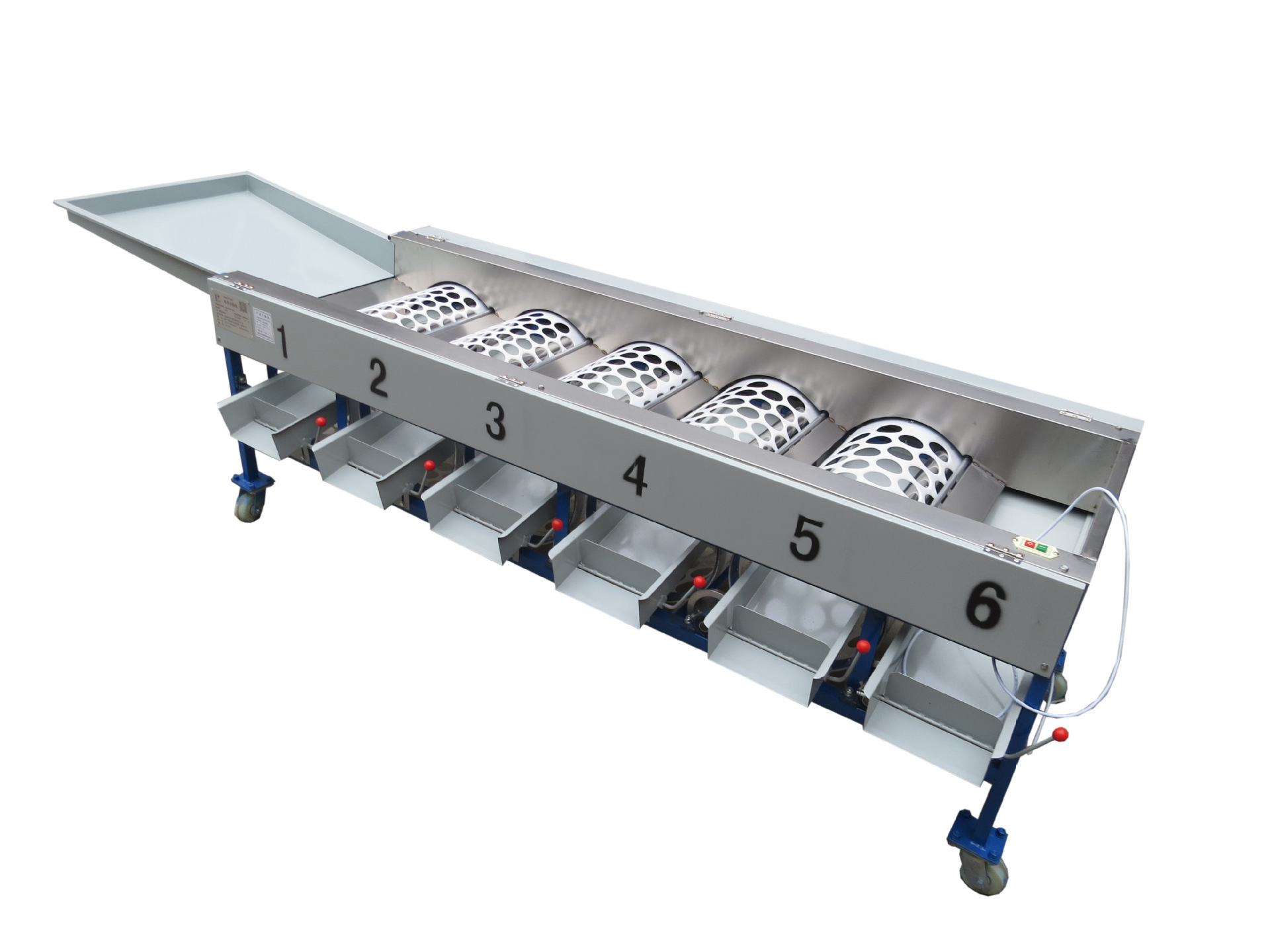 設備是由鐵板斗和分級機組成,分級機是5筒6級組成,根據果蔬的直徑來分選大小