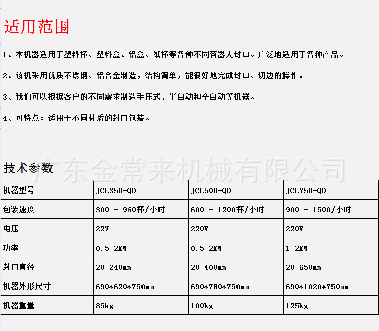詳細(xì)信息 訂貨號5040氣動封盒機 加工定制是 貨號5040氣動封盒機 類型包裝封口機 品牌金常來 型號5040氣動封盒機 功率0.5--2(Kw) 重量100(kg) 外形尺寸690*1000*750(mm) 包裝材料塑料/紙杯/鋁罐/不銹鋼 包裝類型管/罐/桶/盆/碗/盒/杯/瓶 生產(chǎn)能力16(次/分)