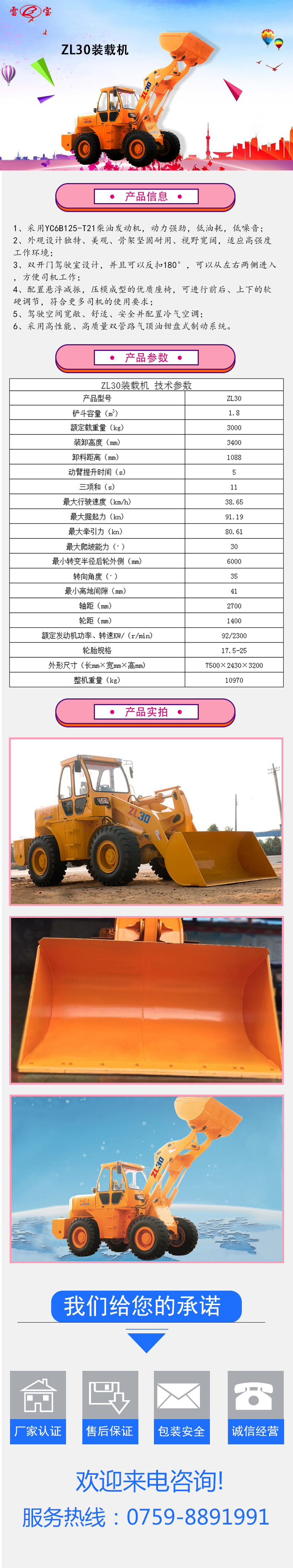 詳細信息 訂貨號1 品牌雷寶 型號ZL30 貨號1 額定載重3000kg 裝載機械類型中型裝載機 動臂提升時間5(s) 鏟臂提升時間-(s) 最大牽引力80.61(kN) 額定斗容量1.8(m3) 發動機功率92(kw) 整機重量10.97(t)
