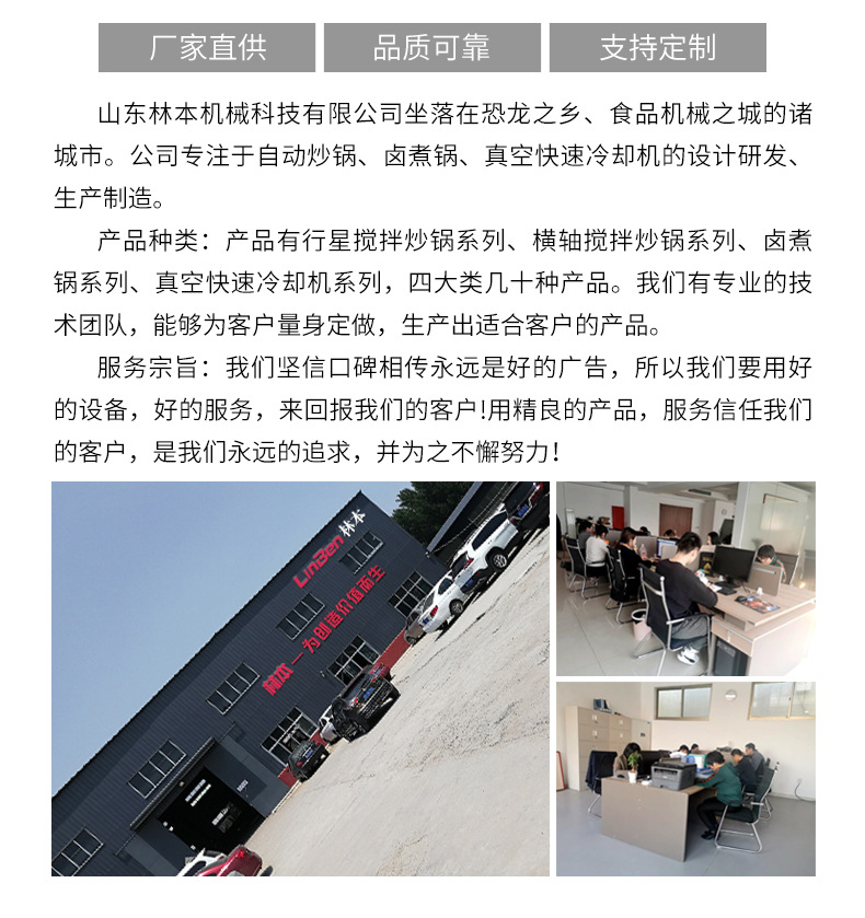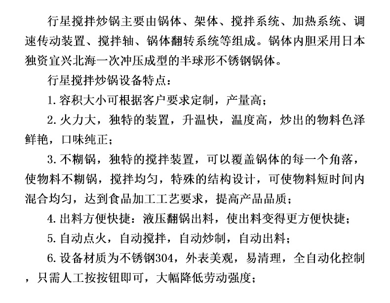 詳細(xì)信息 訂貨號(hào)XX001 加工定制是 貨號(hào)XX001 種類攪拌炒鍋 品牌林本 型號(hào)300L 電壓380(V) 功率15(Kw) 外形尺寸1820*1830*1653(mm) 凈重300(Kg) 包裝木箱 適用范圍休閑速食設(shè)備,茶餐廳設(shè)備,面包房設(shè)備,蛋糕房設(shè)備,中餐店設(shè)備,飲品店設(shè)備,咖啡店設(shè)備 營銷新品 售后服務(wù)一年保修終生維護(hù) 規(guī)格定金