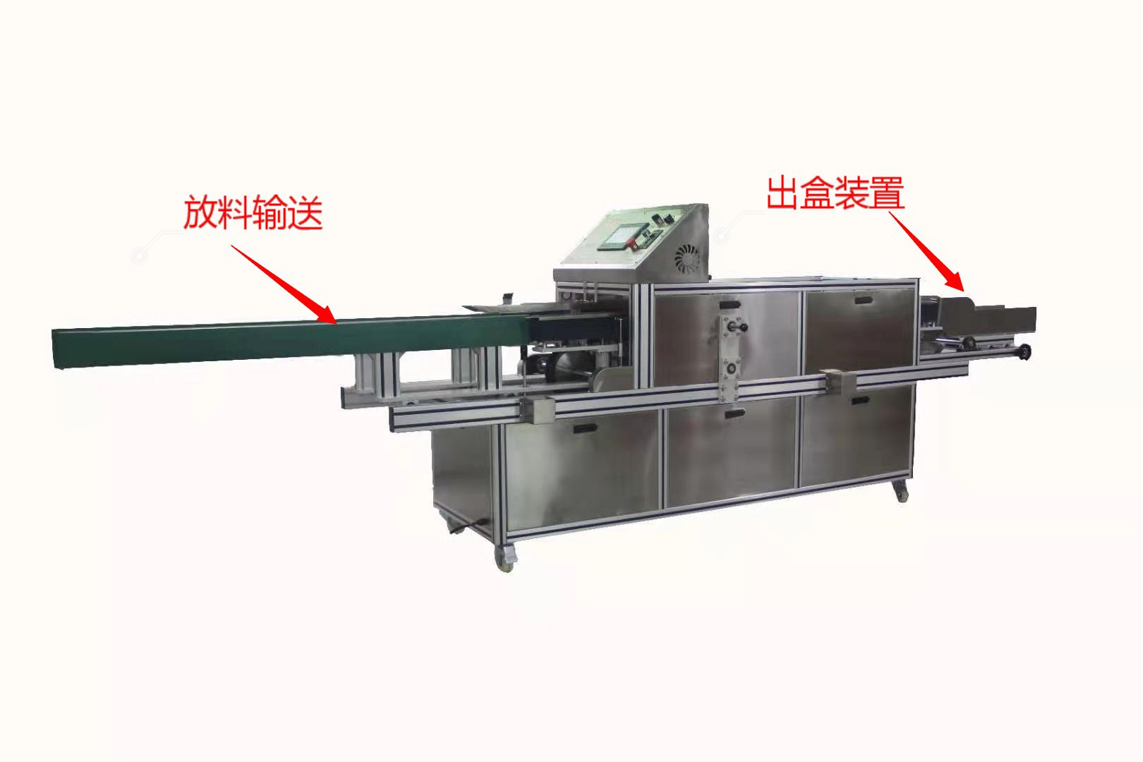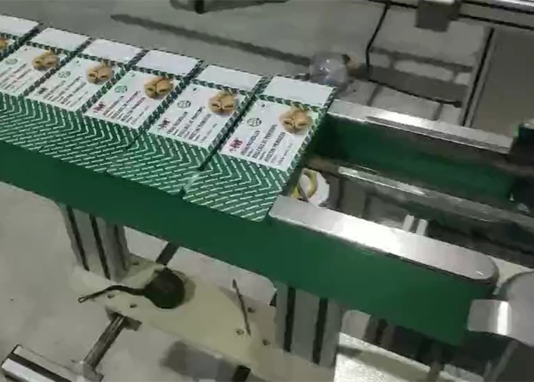 四、把裝好產(chǎn)品的紙盒放入進口輸送帶