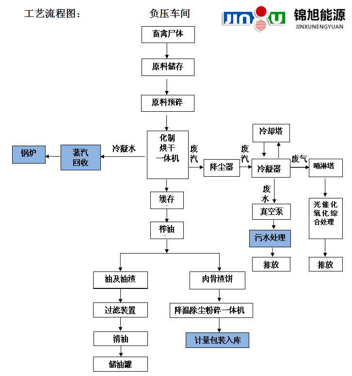 3、由于在化制烘干過程中物料中的水分大部分被蒸發(fā)掉,因此存放物料時不會產(chǎn)生大量的惡臭蒸汽,且后續(xù)物料運輸在封閉的環(huán)境中運行,不會產(chǎn)生惡臭氣體外溢的情況。