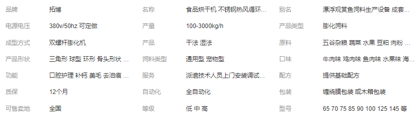 該生產設備可以通過調整原料、溫度、水分等工藝參數,使產品具有形狀新穎、口感獨特、營養(yǎng)豐富、組織細膩之特點,適合不同寵物的口味。該生產線廣泛適用于狗、貓、魚蝦、狐貍、鳥及各種寵物飼料的生產,是不同生產廠家比較理想的選擇。隨著寵物的種類的不斷地增加,各種寵物又有成年和幼小之別,對寵物食品的要求也不斷提高。公司根據這一市場需求,研制和開發(fā)了多種型號的寵物食品生產線,根據產量的不同,該生產線也有多種配置。