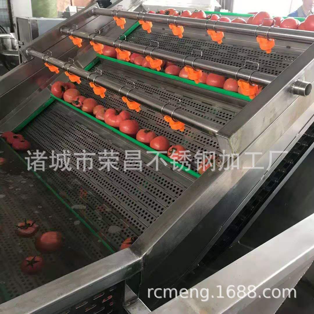 2、該機利用旋渦風泵通過送汽管槽底送氣排管上的小孔,向水槽水中送氣,通過高壓水的射流作用產生大量氣泡及渦流對果蔬進行翻動沖洗,被分離過的泥沙通過隔渣孔板沉入槽底,毛發纖維蟲卵漂浮在水面,被水流推入兩角的隔離板內,以此循環將果蔬洗凈,如兩臺并用,進行粗洗。清洗線,清洗線