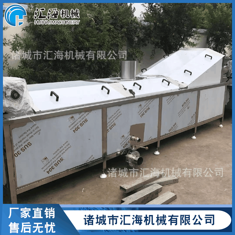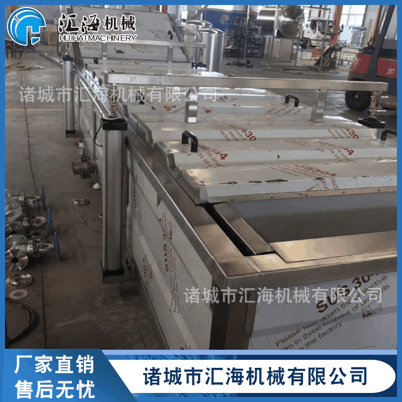 (果蔬漂燙殺青)巴氏殺菌機特點:本機以熱水為介質,整體采用不銹鋼制作,無極變頻調速、噪音低、運行平穩,可根據產品的要求對溫度和時間進行任意調整。該機結構緊湊、操作方便、故障率低,加熱方式采用鍋爐蒸汽、鍋爐熱水加熱,特別適合連續蒸煮作業。設備采用手自控溫系統,水質升溫快、受熱均勻、溫差小、溫度可調,水浴式巴氏殺菌功能可有效的將物料均衡的混合在介質水中,提供了對物品的(果蔬漂燙殺青)巴氏殺菌,更有效地對產品進行護色處理,雙層網帶式設計可將物料全部壓制在水中,避免物料因浮力造成的漂燙不徹底。設備帶有機械提升臂可以把整個槽體提升起來便于網帶底部和設備的清洗。上蓋處帶有水密封裝置,可以避免蒸汽在間隙間泄露??烧{速式輸送系統可有效的控制產品的(果蔬漂燙殺青)巴氏殺菌時間,合格的完成產品的連續(果蔬漂燙殺青)巴氏殺菌工藝。