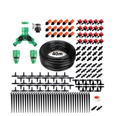 產品明細:水龍頭快接頭2個、Y型三通1個,萬能接頭1個、4/7毛管40米(管子約內徑4mm外徑6mm) 、可調優質滴頭20個 、4/7正三通35個、 4/7固定桿35個、平口三通15個,橘色霧化15個,雙鉤15個,堵頭2個,單鉤15個, 防水生料帶1個。