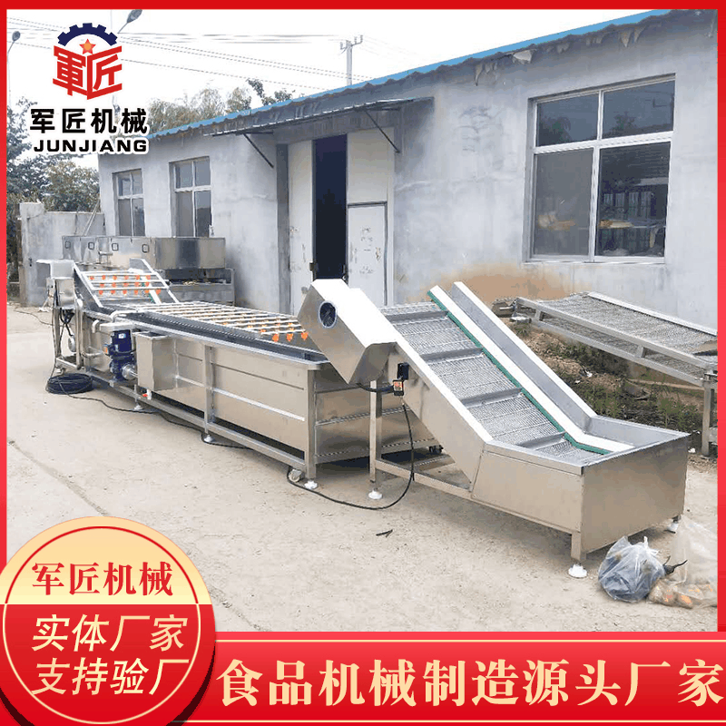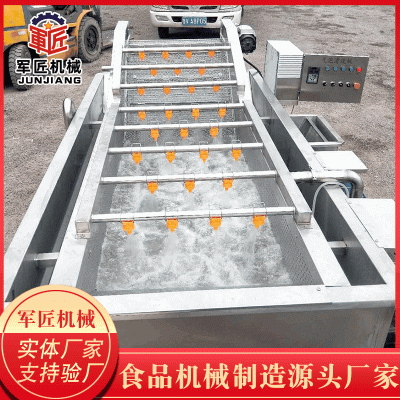 軍匠機械生產的果蔬清洗線在氣泡、沖浪、提升、噴淋等聯合工作下,具有洗潔凈高、節能節水、設備穩定可靠等特點。