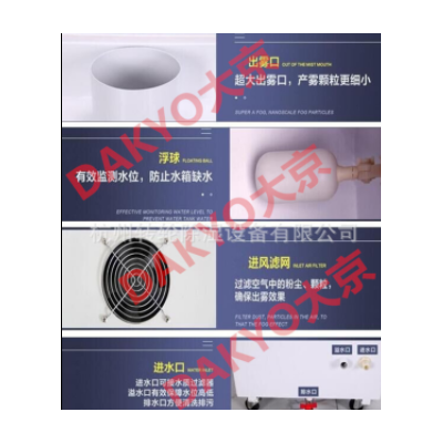 DAKYO大京超聲波工業加濕器采用電子超頻震蕩(震蕩頻率為1.7MHz),通過霧化片的高頻諧振,將水拋離水面而產生自然飄逸的水霧,不需要加熱或化學劑而產生1-5微米的水顆粒漂浮于空氣中,從而達到提高空氣相對濕度的作用。