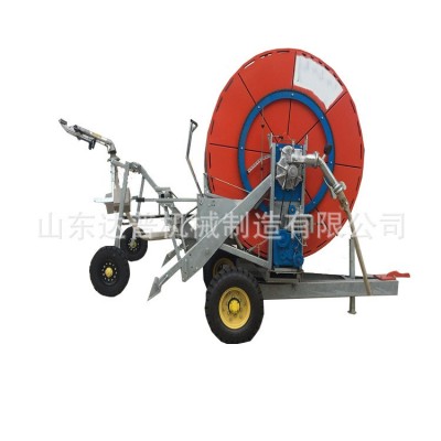 噴頭車回收到主機上,手搖起吊裝置可將噴頭車起吊升高,增高噴頭車行走輪的離地高度,方便噴灌機的移動和運輸;避免噴灌機在移動過程中因路面有溝、坡等導致噴