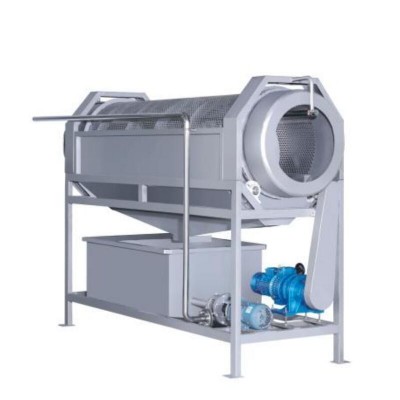 該設(shè)備是利用滾筒翻滾果蔬,同時(shí)在高壓噴嘴的作用下沖洗果蔬,從而達(dá)到清洗果蔬的目的。
