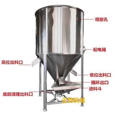 立式攪拌機有多種形式,常用的立式攪拌機主要由:電機輪、電機、桶體、螺桿、出料口、清料口、皮帶輪、視窗、人梯、入口、電器箱、循環落料口、投料口等構成。